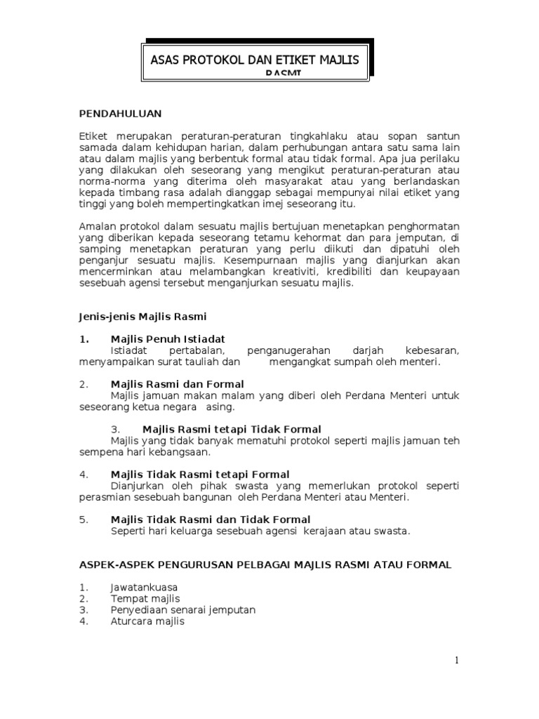 Majlis Rasmi tetapi Tidak Formal Majlis yang tidak banyak mematuhi protokol seperti majlis jamuan teh sempena hari kebangsaan. Perhimpunan dan makan malam pegawai awam pdrm bersama ketua polis negara 2017 CHERAS KUALA LUMPUR 16 November 2017 Pucuk pimpinan Polis Diraja Malaysia PDRM tidak pernah melupakan kebajikan Pegawai Awam yang sama penting seperti mana pegawai dan anggota PDRM di mana segala isu dan permasalahan yang dihadapi mereka diberi perhatian serta tindakan. 3 pengendalian majlis 1.